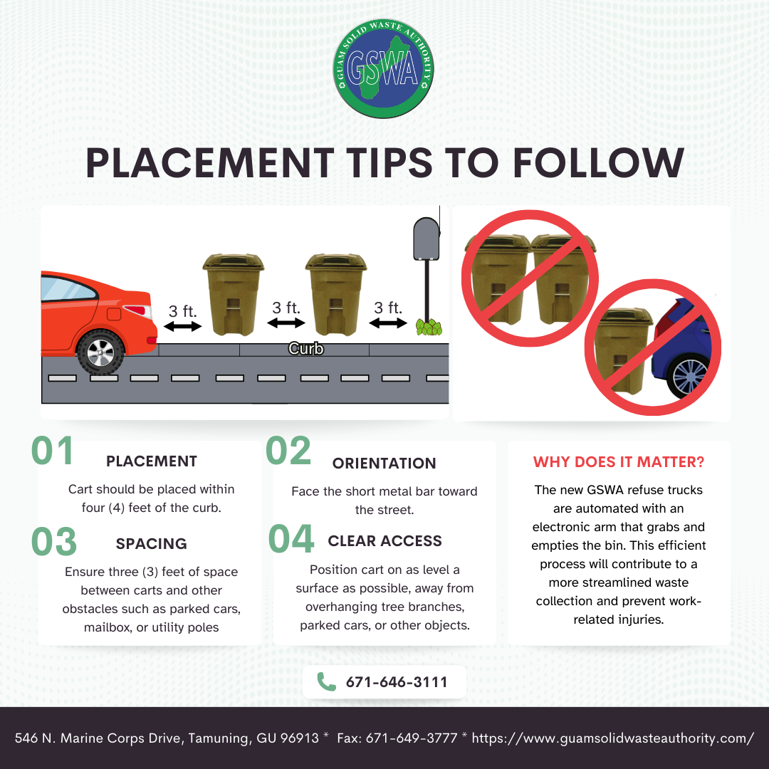 Please read the following documents provided by GSWA regarding how to place your trash receptables correctly so that they can be emptied. These placement tips will assist in ensuring a smooth and safe collection process that’s free from any unneeded obstructions which may have the potential to result in damage to GSWA equipment or your property.
